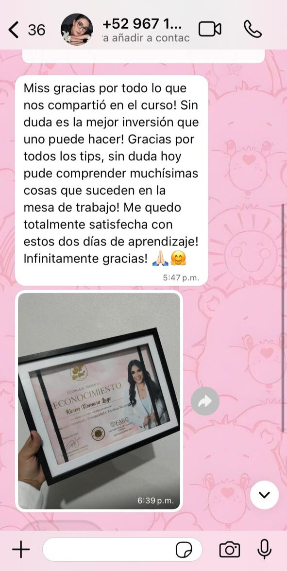 Sí. Al finalizar y cumplir los requisitos del curso recibirás un certificado que avala tus conocimientos en manicura y técnica profesional, respaldado por una instructora con formación internacional.